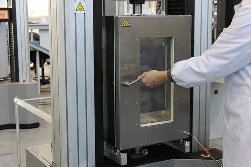 Temperature stability at the sensor after stabilization within +/- 0.5C Heating systems with coated incoloy heating elements to minimise radiant effects. Cooling by liquid nitrogen (N,) regulated by solenoid valve. Forced air circulation via horizontal fan for optimised temperature uniformity on the specimen. Saftey system with over-and under-temperature protection. Automatic shutdown of heating elements and fan when door opening. Front-opening door with double locking system and multi-glazed porthole for test observation and use of extensometers. Chamber supplied with wheels and tracks for easy removal and positionig. Set of heat dissipation disks to limit thermal drift on load cells.