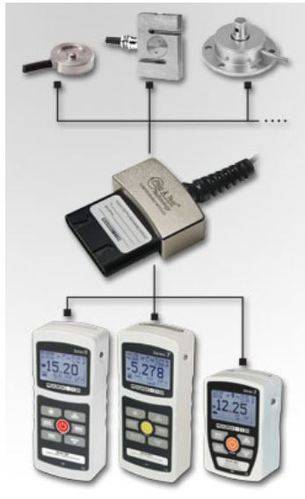 Sensor capacity and resolutions may be programmed via an included software utility, which includes a library of common force capacities from 0.12 to 750,000 lbf (0.5 N to 4,000 kN), and torque capacities from 10 ozfin to 40,000 lbfft (7 Ncm to 57,000 Nm). An identification number may be programmed, which is displayed upon indicator power-up or the indicator’s Information screen. Through Plug & Test technology, all configuration and calibration information is saved within the adapter. This flexibility allows for interchangeability between multiple sensors with any Mark-10 indicator.